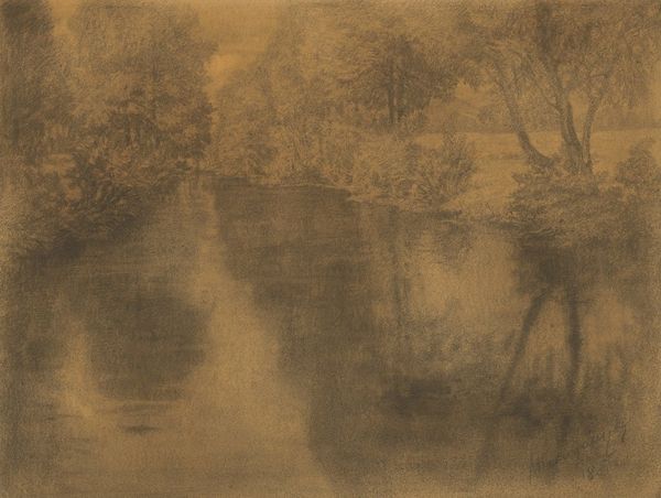 Curator: Ah, here we have what is widely regarded as a truly contemplative and quietly majestic canvas from George Inness. It’s titled "The Home of the Heron.” Editor: My first impression? I feel enveloped in a kind of golden twilight... the colors seem to emanate from within the painting itself, a dreamy echo of a landscape. Curator: Precisely. Inness masterfully employs oil paint here, manipulating its inherent qualities to construct a nuanced spatial architecture. Observe the interplay of light and shadow across the canvas—the geometry creates a distinct recession into the background, punctuated by those soft silhouettes. Editor: The shapes are almost not there, mirages. Makes you want to step in there and listen to the herons and the night insects. And what I find interesting is the balance. Yes, there's that structured perspective you describe, but everything dissolves at the edges... It's controlled, and wild, all at once. Curator: An excellent observation. This negotiation of formal control and expressive spontaneity epitomizes Inness's later work. And there’s a deliberate integration of Romanticism and Naturalism... it makes it neither strictly one nor the other. It’s about an experience, almost a psychological experience... not just about an illustration of reality. Editor: It definitely stirs something beyond mere recognition. I wonder, looking at the way the heron is poised within the brushstrokes, if the painting isn't also a meditation on time... that brief, glimmering space between one moment and the next. It seems like Inness has frozen a moment of complete stillness for eternity. Curator: That may well be his intent. The semiotic implications suggest that. Inness invites us, then, to become co-inhabitants of that moment, allowing for continuous construction of meaning. Editor: Which brings me back to where I started… a landscape radiating light and sound and…possibility. An image simultaneously there and not there. The eternal moment made material. Curator: Indeed, the more we analyze this piece, the clearer it becomes just how effectively it invites us into conversation— both with its components and within ourselves.