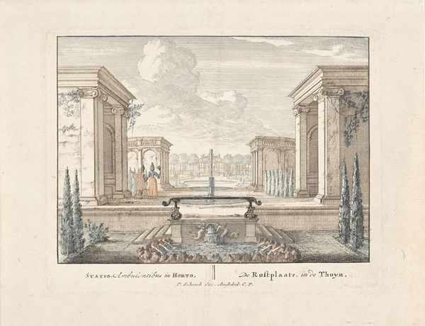 Jan van Call created this vista of the Amfitheater te Kleef using pen and watercolor. At first glance, the use of line to create symmetry is striking. The central axis, anchored by the tiered fountains, extends into the distance, drawing the eye towards a far-off structure. This linear precision structures the landscape into neatly defined zones, almost as if the natural world has been subdued by human will. Notice how the artist uses color washes to create volume and depth, yet maintains a sense of flatness. Van Call was working at a time when formal gardens became symbolic of power and control, reflecting the era's emphasis on rational order. Here, the semiotics of space and perspective are deployed to assert dominance over nature. This isn't merely a depiction of a garden, it's a statement about humanity's ability to organize and dominate the world around them. The linear structure suggests a pre-determined route, underscoring the theme of controlled, directed experience.