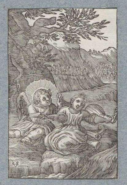 Curator: This is Christoffel van Sichem II's "Engel sluipt weg van slapend kind," an engraving dating to 1628 and currently held at the Rijksmuseum. It's rendered in ink using drawing techniques. Editor: It has such a dreamlike quality! The stark contrasts created by the engraving technique give it a sort of haunting feel, wouldn't you agree? And the angel, so luminescent against that landscape. Curator: Indeed. I think understanding the cultural context of engraving is key here. Consider how printmaking made images and ideas accessible. Van Sichem’s workshop reproduced works by masters and produced their own designs, widely consumed by a growing literate public. The angel becomes a reproducible commodity. Editor: Right, the technical reproducibility… Yet, looking at it purely from a formal perspective, there’s something almost geometric about how the landscape is constructed. See the deliberate layering and hatching that defines each plane? The angel's halo feels structurally important in echoing this layering and guiding our sight. Curator: I would suggest that the image becomes more complex than that. Note how printmaking relied on workshops. While attributed to van Sichem, the image’s production relies on collaborative labor, which traditional connoisseurship obscures. We often emphasize singular artistic genius, at the expense of understanding this engraving as the output of collective skill. Editor: Certainly a key perspective! For me though, despite its clear religious subject matter, the emotional impact is really tied to how that light from the angel breaks through the heavy, earthly lines around it, emphasizing their distinct existence but making us believe that connection between angel and man is reachable through belief and faith. It is rather comforting. Curator: The social role is more pertinent, though: these readily available images reinforced the power of faith within Dutch society, an affirmation in times of turbulence. Editor: Yes, seeing this interplay of craft and material is fascinating. Curator: Precisely, and essential for comprehending the work's full significance.