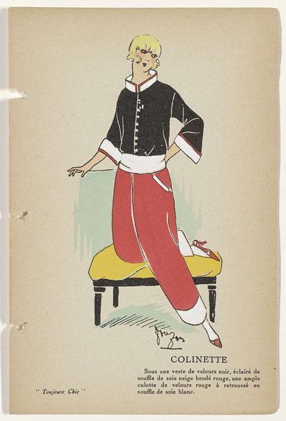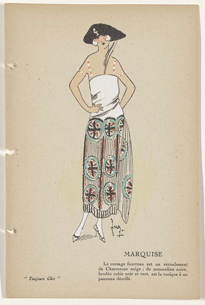 Editor: This is "Toujours Chic Les Robes, Hiver 1921-1922: Novelty," an illustration by G-P. Joumard. It's a striking piece, very much of its time. The contrasting colors and the rather bold skirt pattern give it a sense of playful modernity. How do you interpret this work? Curator: What I see is an interesting moment of tension and negotiation within the representation of women at the dawn of the Roaring Twenties. Consider the social context. After the upheaval of the First World War, there was a renegotiation of gender roles and an increasing desire for female autonomy, something reflected in fashion. How do you think the artist engages with or perhaps even resists these shifts? Editor: That's an interesting perspective. I hadn't thought about the potential resistance. I was so focused on the bold style. But now that you mention it, while the skirt is daring, the long, almost prim top, and the rather serious expression on the woman’s face does create a contrast. Curator: Precisely. Is this a celebration of the 'New Woman,' or does the artist offer a more complex view? Think about the limitations still imposed on women, even as they gained more freedom. The clothing is presented as "Novelty", but is that a positive thing? How much does that dictate the cultural standing of women during that era? The sketch sits on the fence in an era where everything started to shift. Editor: So, perhaps the illustration is commenting on the tightrope women walked, embracing new styles and freedoms while still adhering to certain social expectations. The description below also dictates materials for an outfit. So it isn't just 'novelty' to wear, but an expectation. Curator: Exactly! By viewing this illustration as more than just a fashion plate, we can unpack these complex negotiations and begin to understand the cultural shifts in play during the interwar period. The context enriches our reading, doesn’t it? Editor: Absolutely, I see it in a completely different light now. Thanks for sharing your insights!