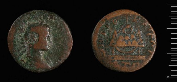 Curator: This is a coin of Gadara minted under Gordian III. It offers a compelling look at the material culture of the Roman Empire. Editor: It feels so worn, almost like it's whispering stories from a bygone era. The images, though faded, hint at a powerful narrative. Curator: Indeed. The coin's mass, about 13.69 grams, represents not just its worth, but the labor, trade, and resource extraction tied to its production and dissemination. The very act of minting these coins was a form of imperial propaganda. Editor: Yes, and consider the imagery itself! What does this choice of symbols tell us about the city’s identity? The messages they wanted to convey about power, prosperity, and their place in the Roman world? Curator: It’s remarkable how something so small physically could have such a large impact on markets and even psychology. Editor: Absolutely. Holding it, you feel a direct link to the cultural values of the past. Curator: Studying the material properties reveals insights into ancient technologies, trade routes, and power structures. Editor: A powerful testament to symbols, indeed!