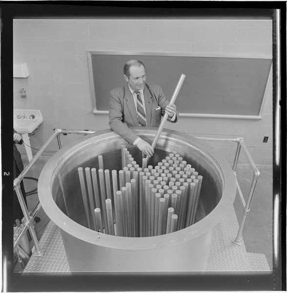 Editor: Jack Gould’s "Untitled (scientist adjusting lage rods inside reactor)" really strikes me as a moment frozen in time. What cultural significance do you see in this image, especially given the subject matter? Curator: This work resonates with the anxieties and hopes of the atomic age. The scientist, almost Christ-like, manipulates the rods—symbols of immense power, both creative and destructive. Do you see the stark contrast in the image? Editor: Yes, the intense highlights and shadows definitely amplify that duality. It’s like a visual representation of the fears and promises associated with nuclear energy. Curator: Exactly! It reflects our collective memory of a time when science seemed to hold the keys to both utopia and oblivion. The rods become more than just objects; they are icons. Editor: It's fascinating how a seemingly straightforward image can hold such complex cultural weight. I'll definitely be thinking about this one for a while. Curator: Indeed. Images often operate as powerful carriers of shared experience.