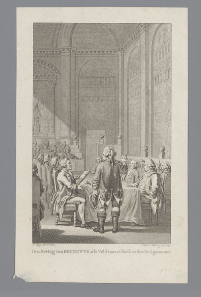 Editor: This drawing, made with pen and ink around 1788 to 1790 by Jacobus Buys, depicts "The Reception of the First Dutch Envoy in the American Senate, 1783". The scene has such a formal, almost staged quality. What strikes you when you look at it? Curator: Indeed, that sense of formality resonates. But let’s consider what the artist chooses to show us, and more importantly, what symbols might be embedded within. What kind of cultural exchange is on display? What are your thoughts on that central handshake? Editor: Well, the handshake feels incredibly significant, a physical manifestation of diplomatic relations. But it also feels a little...stilted? Perhaps because everyone else is just watching. Curator: Precisely. Consider the composition itself: the figures arranged almost as a frieze. This harkens back to classical imagery, invoking a sense of historical weight and legitimacy for this newly formed relationship. Even the clothing, though of the time, suggests a timeless, virtuous scene. Does that strike you as contrived, or meaningful? Editor: Meaningful, I think. It’s like they are trying to create an instant historical precedent. Projecting gravitas onto the event, if that makes sense? The artist and those he represented wanted this encounter to have lasting weight. Curator: Exactly. Think of the power dynamics at play here. The Dutch Republic was among the first to recognize the United States. The symbolic weight of that act and how it cemented cultural memory and the narratives they want to persist through generations, like this image. It becomes more than just a record, wouldn’t you agree? Editor: Absolutely. I hadn’t considered the way the artist uses classical references to amplify the importance of the event itself. Now I see how it acts as both a historical document and a piece of persuasive visual rhetoric. Thank you. Curator: My pleasure. Looking at art like this makes me rethink how much cultural symbolism we consume daily without fully understanding its underpinnings.