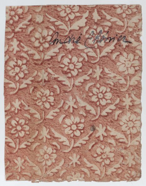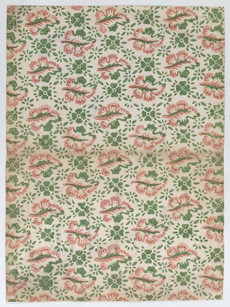 Editor: Here we have an enchanting book cover, likely crafted between 1700 and 1800 by an anonymous hand. It's currently held at The Met, and the piece gives an overwhelming feeling of nature reclaiming something. Its red floral design is quite striking and almost has the sensation of warmth washing over you. What sort of emotions or thoughts does this image stir in you? Curator: It tickles my fancy like a whisper of secrets from centuries past! Imagine holding a book cloaked in this textile – suddenly, reading isn’t just absorbing words but an immersive sensory experience. I find myself wondering, was this pattern mass-produced, adorning countless volumes, or was it a precious, one-off creation, making each book a unique treasure? Does that dusty rose background hint at the fading beauty of time, or does it possess some kind of symbolism we might investigate? Editor: It could almost be a faded memory imprinted onto cloth. Now I'm really curious, thinking of the books wrapped in covers such as this! What do you make of the artist choosing this repeating leaf and floral pattern? Curator: Well, what's more natural than our repeating cycles of experience? Perhaps that is why I think of a personal memory. The pattern might symbolize themes that ran through those pages. Picture a novel filled with characters mirroring life's blossoming joys and inevitable wilting sorrows. The repeating pattern may amplify and emphasize themes or metaphors. It’s a playful reminder that within any large, exciting shift in time, the quiet hum of daily experience always flows. Editor: That's such an interesting observation. I like how that transforms what looks like a simple floral pattern into something richer. I am seeing this in a completely new way. Curator: I think the real joy of looking at a piece like this is just following your own curiosity, allowing your own experiences to touch this piece from the past. I think it's all about making space for a kind of magic.