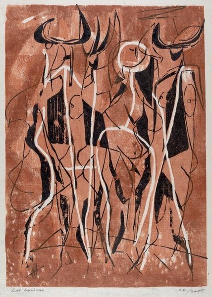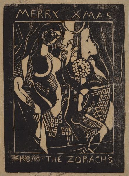 This is Adja Yunkers's "Untitled (Christmas Card)," a woodcut print of graphic forms. Born in Latvia in 1900, Yunkers’s life was profoundly shaped by the tumultuous events of the 20th century. Yunkers, a Jewish man, fled Europe in the face of Nazi persecution, eventually finding refuge in the United States. This personal history of displacement and survival is embedded within the artwork. The stark contrasts and abstracted forms evoke a sense of unease, mirroring the alienation of exile. Christmas cards often represent harmony and togetherness, but Yunkers offers a strikingly different vision. The figures, rendered in bold black lines against a rusty-red background, appear spectral and fragmented. Are these figures arriving or departing? What narratives are concealed beneath this surface of this Christmas scene? Yunkers’s print invites us to reflect on the complexities of identity, history, and the human condition, revealing the multifaceted layers of celebration and crisis.