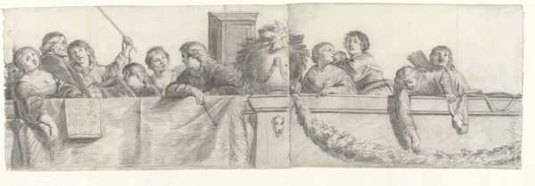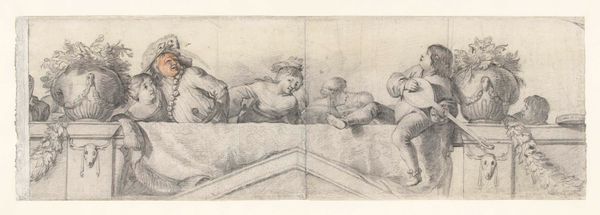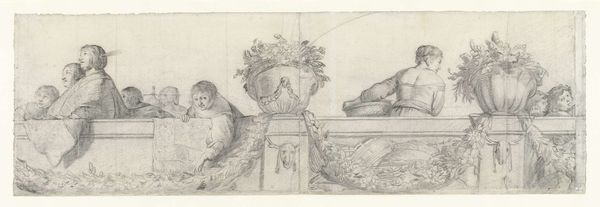 Curator: Cornelis Holsteyn’s "Persons on a Balustrade with Festoons" – done between 1633 and 1638 – really grabs your eye, doesn’t it? This pencil drawing on paper, currently housed in the Rijksmuseum, just hums with life. Editor: Yes, a life lived by pale ghosts it seems! It's a little melancholy to me, with its figures confined behind that ledge and rendered in such delicate shades of gray. It almost feels like they're watching us from another, unreachable, world. Curator: Precisely! And I find that the architectural detail gives us just enough context while keeping a delightful ambiguity around what's truly going on in the scene. Holsteyn captures something special with these few figures set against the backdrop of Baroque ornamentation, don't you think? Editor: The balustrade itself functions as a social barrier, doesn't it? They’re positioned both as spectators and as those being observed. The garland draped along the balustrade, the skull, the seashell...these details echo ideas related to Dutch Golden Age sensibilities, invoking vanity and memento mori symbolism. I read the work as commenting on power dynamics present even in leisurely settings, you know? Curator: It makes one consider what world are we invited to access as a spectator! It is curious. Speaking of context, it’s incredible to consider that during this period, Dutch art moved indoors. You had people captured at everyday activities with that characteristic blend of realism and symbolic layering. "Genre Painting" comes to mind, no? Holsteyn creates the drawing within a society wrestling with its identity, commerce, and its place in the world. Editor: And maybe that balustrade reminds me a little of how, even now, access to these so-called leisurely spheres—the arts, culture—isn’t distributed equally. Some gaze, some perform, some can’t even see over the edge, eh? Curator: I think both interpretations exist in dialogue with the artwork and can shape a really interesting engagement for viewers. It captures the human tendency of wondering what could lie beyond your own fence. Editor: Mmm. Ultimately, art always leaves space for more voices to enter the scene, even a crowded one behind a balustrade, it seems.