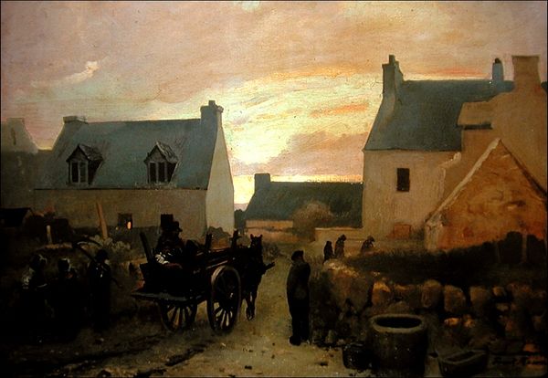 Editor: Here we have Claude Monet’s “Farmyard at Chailly,” created around 1865 with oil paint. It’s a striking image, almost like a stage set. I’m initially drawn to the way the buildings and ground plane are lit, casting interesting shadows. What stands out to you about it? Curator: It's fascinating how Monet, at this relatively early stage, grapples with capturing not just the *what* but also the *how* of seeing. Think about what “plein air” painting meant in 1865 – an assertion of direct experience over academic studio conventions. What might this depiction of rural life say about emerging socio-political ideas about agrarian society and industrialization during that period? Editor: So you're saying this simple farmyard scene might be a statement about broader societal shifts? It seems pretty straightforward. Curator: Well, consider who was buying art like this. The burgeoning bourgeoisie. These weren’t landowners. This image presents an idealized vision of rural life that was becoming increasingly distant for many city dwellers. It speaks to a kind of nostalgic longing, even a commentary, on disappearing ways of life amid rapid industrialization. Monet isn't just painting a farm; he's curating a view of the countryside for a specific audience. How do you see the figure interacting with the space? Editor: That figure almost disappears into the scene. He seems to blend into the chicken-filled yard. It adds to that feeling of the every day. Curator: Precisely! This unassuming scene, at closer inspection, embodies complex dynamics. The museum space, displaying such paintings, is itself a key element, enshrining and sometimes distorting these views over time. Editor: I never thought a farm scene could be so intertwined with industrialization and social classes. This makes me rethink how to view artworks within a broader social context. Thanks! Curator: It highlights the importance of viewing artworks through a historical lens. Each brushstroke is also a record of its time, its relationship to viewers, patrons, and the evolving socio-political sphere.