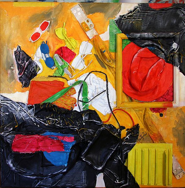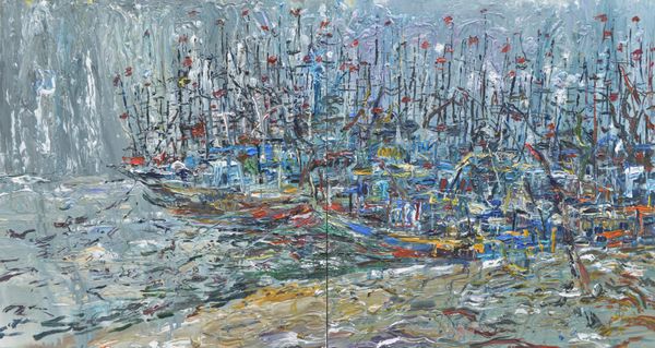David Michael Hinnebusch made this painting, “A+”, using bold, expressive strokes and a high-key palette. I love how Hinnebusch embraces process; you can almost feel the energy of his movements across the canvas. The materiality here is striking. The paint is applied in layers, thick in some areas and thinned out in others. Look closely at the way the blue paint drips and pools, creating a sense of depth and movement in the water. The bright yellows and reds contrast with the blue, adding to the painting's intensity. The figures are rendered with a raw, almost childlike simplicity, which is echoed in the scrawled signature in the corner. This reminds me a bit of some of the early expressionist painters, like Kirchner, who were also interested in capturing raw emotion through bold color and gestural mark-making. Ultimately, this painting invites us to embrace ambiguity and find our own meaning within its vibrant chaos.