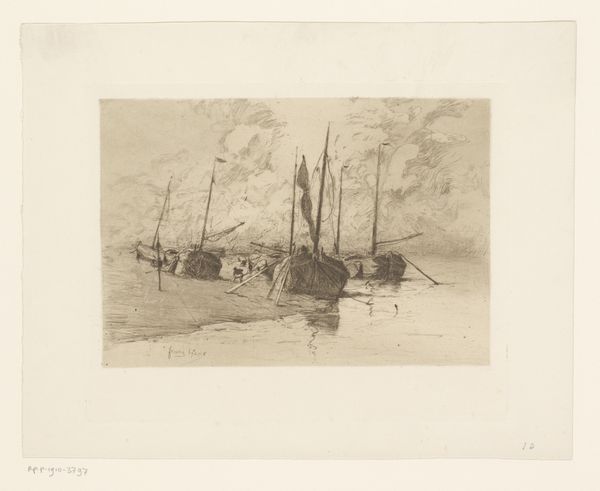 Carel Nicolaas Storm van 's-Gravesande created this etching of the port of Bergen op Zoom. The composition of this print is carefully structured around horizontal bands of land, water and sky. The artist employs line and texture to evoke a sense of spatial depth and atmospheric perspective. Look closely at how the dark, dense marks in the foreground gradually lighten as they recede towards the horizon, creating an illusion of distance. The etching technique, with its fine lines and tonal variations, captures the subtle gradations of light on water and the textured surfaces of the clouds above. The composition destabilizes any fixed point of view to evoke feelings of tranquility and contemplation. Notice the delicate balance between representation and abstraction, the tension between the real and the imagined. It invites us to question our perceptions and appreciate the beauty of impermanence.
