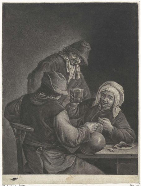 Curator: This engraving, attributed to Frans van der Steen, is titled *The Drinker and His Wife Reading a Letter*. Editor: It's a rather intimate scene. The couple seems caught between anxiety and anticipation as they decipher the letter's contents. Curator: Absolutely. The jug and pipe suggest a domestic interior, a space of shared life. Letters, you see, were potent symbols of connection and disruption. Editor: I think what strikes me is how the woman's hand is over his shoulder, a gesture of support or perhaps control. This speaks volumes about gender dynamics of the time. Curator: Indeed, these images echo familiar narratives. The letter becomes almost like a mirror, reflecting the inner lives of the figures and societal values of domesticity. Editor: Looking closely, the etching seems to capture a moment of complex intersection between personal lives, social expectations, and that little bit of hope or fear we feel upon receiving news. Curator: It's fascinating to consider how this simple domestic scene triggers larger questions about culture. Editor: It leaves me wondering about the power of ordinary images to reveal extraordinary stories.