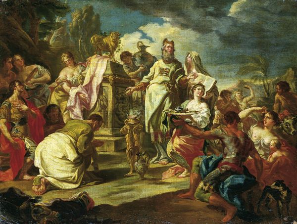 Editor: This painting, by Luca Giordano, is titled "Series of the Four Parts of the World: America." It's oil on canvas, and it looks incredibly busy, full of figures and detail. There’s this powerful Indigenous figure with a bow and arrow, but also ships in the distance suggesting conquest. What can you tell me about this complex scene? Curator: It’s crucial to understand this through the lens of its historical context. Allegorical representations like this were very common in Baroque art, specifically within institutions that wielded symbolic power, such as royal courts or academies. Consider what "America" represented in the European imagination at the time: a land of exoticism, natural abundance, and, most importantly, potential conquest. Editor: So, it’s less about accurately depicting America and more about European perceptions? Curator: Precisely. Note the idealized, almost classical figures, even the indigenous ones. Giordano isn't striving for ethnographic accuracy. Instead, he’s using allegory to articulate a certain narrative— one of European dominance and the "civilizing" of the Americas. See how the figure of America is partially nude? It plays into the trope of the ‘untamed’ land awaiting European influence. Editor: I hadn't considered how much power is embedded in even seemingly simple choices, like depicting a partially nude figure. So, how was a piece like this displayed and viewed in its time? Curator: These paintings often adorned palaces or important administrative buildings, reinforcing the power structures of the time. Viewing wasn’t passive; it was a reinforcement of a specific worldview – the right to expansion, resource extraction, and cultural reshaping. Understanding the politics of imagery in works like these helps us understand historical power dynamics. Editor: That really reframes the entire artwork for me. It’s not just a beautiful painting, but a carefully constructed statement about power. Curator: Exactly! And recognizing that embedded ideology allows us to critically examine how these historical representations continue to influence our understanding of the world today.