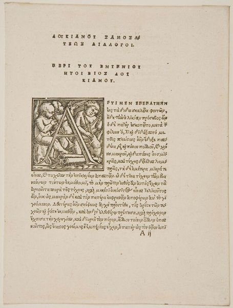 Curator: Here we have an anonymous printer's mark of Geoffroy Tory, dating from 1532. The block printing shows a heraldic emblem. Editor: The stark contrast of the black ink on this aged page immediately conveys a sense of austere dignity. The textures and lines feel remarkably graphic. Curator: Indeed, the composition is quite striking. Notice the careful arrangement of the symbols: the broken tools, the cornucopia, the open books. Editor: The materials also tell a story: the handmade paper, the carefully carved woodblock, the labor-intensive printing process. It speaks volumes about the artisan's world. Curator: It's a fascinating example of how art and craft were intertwined in the early modern era. Editor: Seeing it here, centuries later, is a potent reminder of the tangible history embedded in even the simplest printed page.