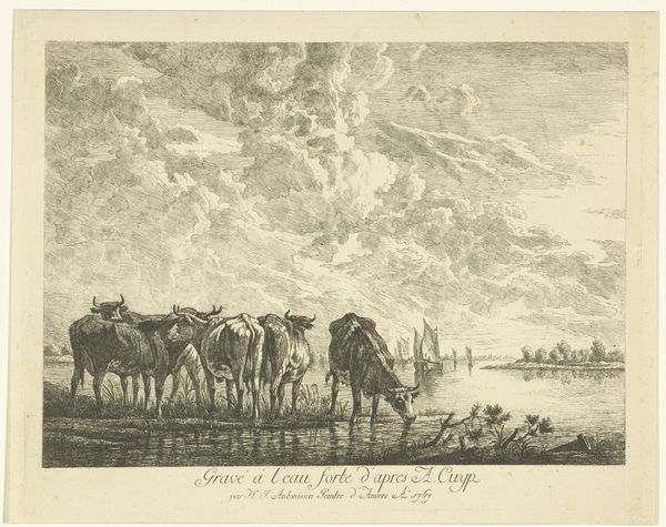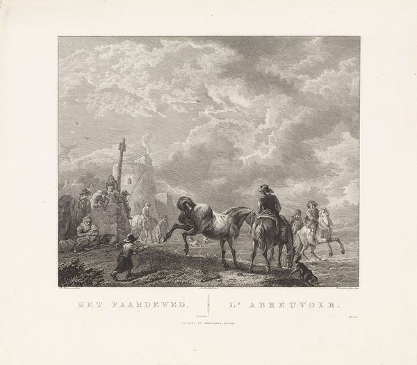 Editor: This is "Farmers Finding Weapons in the Field," a pencil drawing by Simon van den Berg from 1855, currently at the Rijksmuseum. It feels like a very direct, unassuming scene – a family and their ox in a field, with something ominous discovered at their feet. What symbolic weight do you see in this image? Curator: Indeed. The unexpected presence of discarded weapons transforms a peaceful agrarian scene. The farmers represent timeless toil, connection to the land. The weapons, though, are a disruption; they suggest recent conflict, perhaps a battle or political upheaval that the land silently absorbed. The ox pulling the plough? It’s a potent symbol of resilience and endurance. Editor: Resilience how? Curator: Oxen are work animals, stoic symbols of relentless labor, aren't they? Their presence here speaks to an enduring way of life, even in the face of violence. But look closer, what do the positions of the man and woman, juxtaposed with these weapons, tell you? Editor: Well, the man seems curious, almost examining one of the weapons, while the woman stands slightly apart. Does that speak to gendered responses to violence perhaps? Or a shared concern for the future? Curator: Possibly both. The discarded arms themselves become symbols of uncertainty. The potential disruption of peace. Consider too, the Romantic landscape tradition... isn't it ironic, with man dominating the wilderness suddenly becoming witness to the residue of human conflict. The visual vocabulary is rich. Editor: That makes so much sense! I was focused on the surface narrative, but the interplay of symbols reveals a much deeper, unsettling commentary about the human condition. Curator: Precisely. Images often hold layered meanings accumulated across generations. "Boeren vinden wapens op het land," captures both a moment in time and a timeless human struggle.