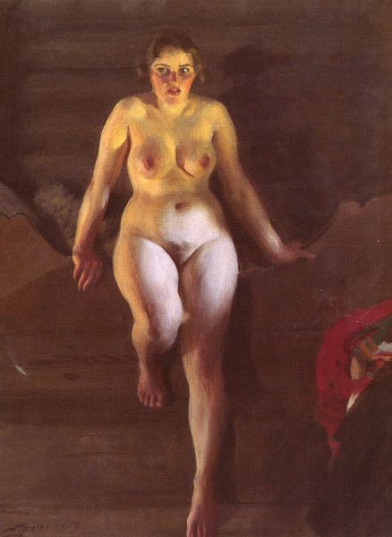 Curator: Looking at Franz von Stuck’s "Susanna and the Elders," painted in 1904, the first thing that strikes me is the stark emotional vulnerability, despite the biblical narrative. Editor: Yes, the swirling waters around Susanna feel… violated. As if the artist plunged us right into her inner turmoil. I can feel my skin crawling just looking at those old geezers leering from behind! Curator: Observe how von Stuck masterfully uses light and shadow. The stark contrast heightens the tension. Susanna is bathed in light, while the elders lurk in the darkness, visually representing good versus evil. Editor: It’s pure visual theater, isn't it? That darkness you speak of really amplifies the sense of secrecy, that shameful gaze. I feel this perverse curiosity of peeping around with the elders, though it is so ethically problematic, I feel guilty just by watching! Curator: Exactly, the painting operates through visual allegory. The cool, almost detached presentation of the subject matter forces the viewer to engage intellectually and contemplate broader themes. It's a fascinating construction. Editor: It's almost disturbing how attractive and disturbing is it. He lures you in, that German fellow... like he’s enjoying every dreadful brushstroke, really stirring up our guts, as it is visually arresting. It gives me chills to just acknowledge this painting is that visceral. Curator: Indeed. Considering its thematic weight and complex arrangement of figures, the work challenges us to confront uncomfortable aspects of power, morality, and representation within the pictorial space. Editor: The genius lies in creating such strong, conflicting feelings—attraction, repulsion, guilt. "Susanna and the Elders" stays with you long after you walk away. A pretty impressive narrative with some smart execution.