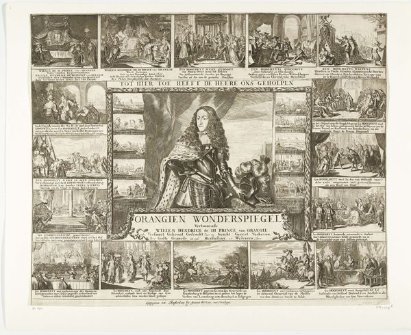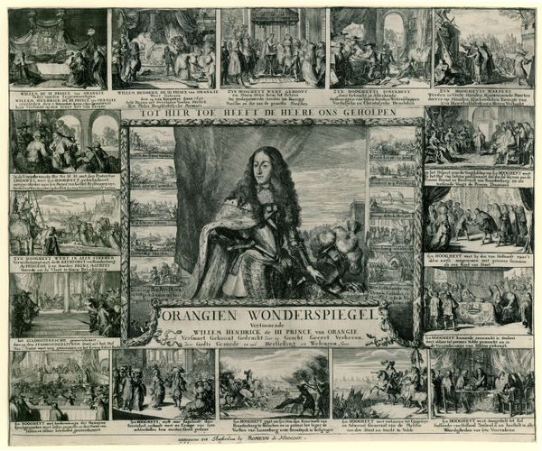 Editor: So, here we have "Witten Wonder Spiegel," or "The Wonder Mirror of the De Witt Brothers," created in 1675 by Romeyn de Hooghe. It's an engraving, quite detailed. I'm immediately struck by its somber tone, like a memorial. The small scenes framing the brothers give it this narrative feel, but to what end? How do you interpret this work? Curator: It feels like walking through a hall of echoes, doesn’t it? De Hooghe doesn't just show us portraits; he offers a meditation on power, reputation, and mortality. I read this piece, created after the brutal murder of the brothers De Witt, as both political commentary and personal reflection. Look closely – the surrounding scenes aren’t just decoration, but fragmented memories of their lives, achievements, and, ultimately, their tragic downfall. Do you sense the tension between honoring them and hinting at the controversies that led to their deaths? Editor: I see what you mean! It’s not a straightforward celebration. There's this weight of something unresolved, almost accusatory. So it's less about pure admiration, and more like a... a complex reckoning? Curator: Precisely. It makes you think about how history is written, doesn't it? What stories get told, and whose voices are amplified. I wonder, when you see this, what version of events comes to mind first, the official or the whispered truths. Which narrative sticks with you longer? Editor: That's powerful. I was so focused on the individual scenes that I didn't realize the print asks questions instead of giving answers. Curator: Art doesn’t always give answers, does it? Sometimes, its truest purpose is simply to spark the conversation, to unveil perspectives unseen. I wonder if the artist felt he was seeking justice or adding another layer of intrigue with this piece? Food for thought, indeed.