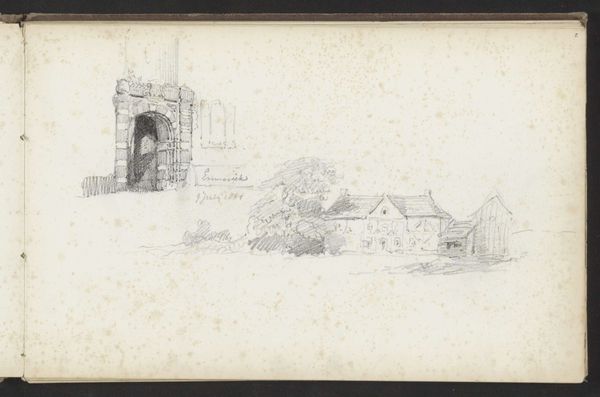 Editor: Here we have "Two Figures by a Ruin," an ink drawing on paper created sometime in the 1700s by Monogrammist AE or AVE. The sepia tones give it a somewhat melancholy feel, don't you think? What can you tell me about the structure and visual impact? Curator: Indeed. Let us consider first the composition. Note how the artist uses a limited palette to create depth and texture. The ink washes are skillfully applied, varying in intensity to suggest volume and recession. Notice, also, the dominance of the architectural ruin and the two figures placed within the landscape: How do you believe this impacts the relationship between the ruin and nature? Editor: I suppose it draws attention to the interplay of light and shadow on the architecture, the crumbling walls set against the smooth open sky, emphasizing the passage of time, wouldn’t you say? Curator: Precisely. Consider too, the structural elements: the interplay between horizontal ground and upright building. What kind of feelings are these structural properties meant to communicate? Editor: Perhaps something to show of human aspiration in architecture alongside nature’s indifference, that only shapes it with age. Curator: Precisely. By focusing on these formal qualities, we are better able to appreciate the artist’s skill and intentionality and develop some sensitivity to period visual norms and values. What would you add? Editor: Thinking about it that way, analyzing how each component works together makes you appreciate the artwork on a different, deeper level. Thank you.