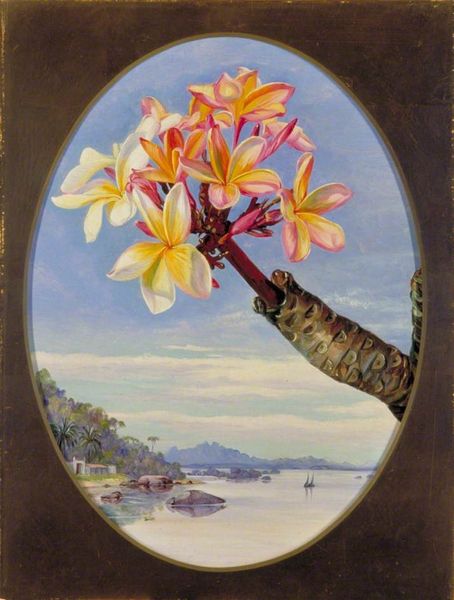 Editor: This is "Distant View of Mount Fujiyama, Japan, and Wistaria," painted in 1876 by Marianne North using watercolor. I'm really drawn to how delicate the wisteria is, especially juxtaposed with the mountain in the background. It's interesting that it was created en plein-air. How do you approach this piece? Curator: What's fascinating to me is to consider North's access to these materials and this location in 1876. Watercolour production and trade routes at the time would have impacted the very colours she was able to render in this image. Do you think the idea of "plein-air" gives this piece authority, signaling her presence on location, directly engaging with a site, and also its resources? Editor: Absolutely. The act of creating a painting like this in front of the subject is far from a neutral, documentary record. It's work, influenced by available resources and the social conventions around travel and art production. Considering Japonisme, could she have easily replicated it from afar? Curator: That's right! Consider the social implications and class status required to make that kind of journey. How does her engagement with Japonisme – which itself depended on international trade – influence the labour inherent in its creation? Is it a genuine appreciation, or does the "exotic" subject matter simply reinforce colonial power structures? Editor: That's a perspective I hadn't fully considered before. Thinking about the production, labour, and resources needed, it really opens up questions about cultural exchange. It feels less like a simple landscape and more like a document of its time. Curator: Precisely. By exploring its means of production and reception, we’ve shed light on the complex networks of labour, material, and power that shaped this serene view.