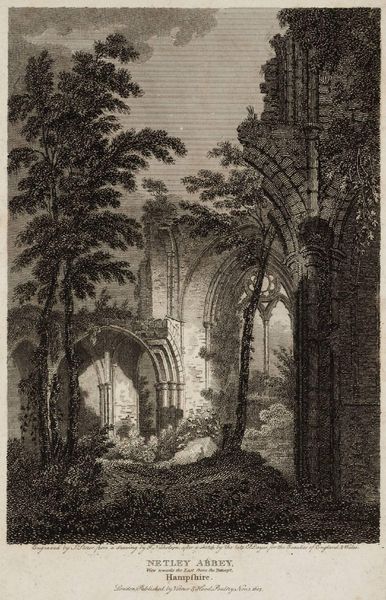 Curator: This is "Remains of Walsingham Abbey, Norfolk," engraved by Scott after John Preston Neale. Editor: It's haunting, isn't it? The skeletal remains of the abbey rising amidst the foliage. Curator: Indeed. Walsingham was a major pilgrimage site. Consider how this print captures the effects of the Dissolution of the Monasteries. Editor: The printmaking process itself would have required skilled labor, from Neale’s initial sketch to Scott’s engraving and the printing and distribution. It speaks to a whole system of production. Curator: And to the changing tastes of the public. Prints like these popularized the picturesque ruin, shaping how people viewed history and national identity. Editor: The detail of the stone work shows the craftsmanship, yet now it's presented as a fragment, part of an industry of nostalgic ruin imagery. Curator: Right. It makes one think about power, belief, and the forces that shape our environments. Editor: Ultimately, a somber reminder of the transient nature of institutions and beliefs.