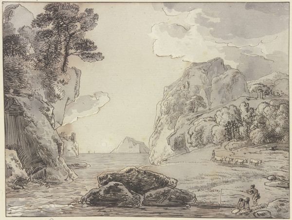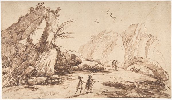 Guercino, an Italian Baroque draughtsman, created this landscape drawing with pen and brown ink. His work emerges during a period of significant social stratification, where wealth and status dictated access to resources and opportunities. The image subtly reveals the artist’s place in this hierarchy. A group of figures are on the upper ground, seemingly observing a waterfall as a spectacle. Below them is a figure struggling against the tide. This composition invites us to reflect on the power dynamics inherent in viewing, and consider the position of those whose labor sustains the very landscapes we admire. Guercino offers not just a scene, but a commentary on the social fabric of his time. Through this drawing, Guercino not only captures a landscape, but prompts questions about the nature of observation, labor, and the subtle ways in which social roles are etched into the scenery around us.