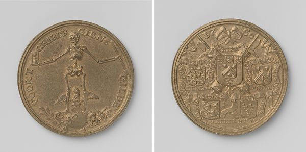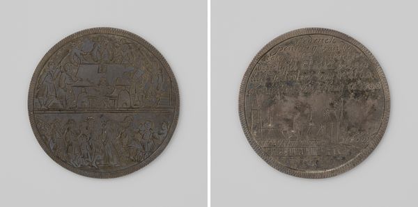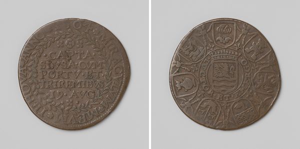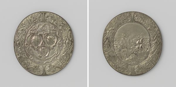 This is a prize medal made by Chris van der Hoef in 1922, probably in bronze. It has two sides, one showing the city and one with an inscription. The city side has got this amazing tower and buildings rendered with such detail. It's like each tiny line contributes to the whole scene, creating a world in miniature. It makes you wonder how he achieved such precision, especially when you consider the material itself and how unforgiving it can be. The lines are almost like tiny brushstrokes in a painting, and, like a painting, the physical handling of the material brings its own liveliness to the image. I love the way the design sort of spills over the edges, and I’m put in mind of some paintings by Kirchner or Heckel, those German expressionists. I think what's important is that the image doesn't get caught up in representation, and instead it offers us something more ambiguous, more interesting to think about.