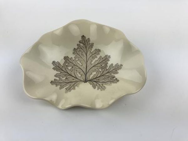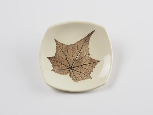 This is an undated ceramic plate by Christian Royal. The leaf design in its center might suggest an interest in nature, or perhaps even an engagement with environmental issues. But let's dig a little deeper. What does it mean to depict nature on a manufactured object like a ceramic plate? The smooth, artificial glaze contrasts starkly with the organic form of the leaf, creating a tension between the natural and the artificial. This tension reflects a broader cultural anxiety about our relationship with the environment. Is this plate a celebration of nature or a commentary on our detachment from it? To answer this question, we might want to explore the history of decorative arts, the rise of environmental movements, and the artist's own statements. By doing so, we can understand not only the artwork itself but also the social and cultural forces that shaped its creation.