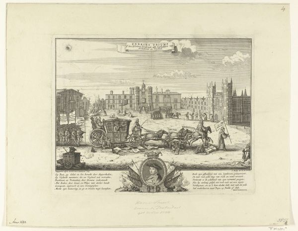 Curator: Let's turn our attention to "Ruïne van de Grote Kerk van Bergen op Zoom," an engraving created between 1772 and 1780 by Simon Fokke. The print captures the ruined Great Church in Bergen op Zoom. What are your initial impressions? Editor: Immediately, I'm struck by the atmosphere of decay and the implications of power structures that have crumbled. You can almost smell the damp stone and feel the weight of lost history, a visual representation of decline. Curator: Absolutely. Ruins carry potent symbolic weight across cultures. In this work, we see not just physical destruction, but also perhaps a meditation on impermanence, the fading of societal power reflected in architecture. This wasn’t simply an aesthetic choice; religious wars impacted the region in 1580s, devastating much of the church. Editor: Precisely. The baroque style, evident in the meticulous details of the decaying structure, heightens the contrast. It begs us to ask: what narratives of power were intentionally left standing in a partially-razed structure and what were fully eradicated? How has the colonial lens shaped such historical views? Curator: Good point. There is that careful rendering. But what do you read from the activity surrounding the church; people appear to be collecting material? Does it depict something sinister in its exploitation, or does this perhaps portray themes of survival and reconstruction? The people carrying bricks perhaps show strength of society beyond religion? Editor: Perhaps both, the lines between sinister and celebratory can be unclear and overlapping. Consider that visual depiction itself is a construct, even in "objective" forms such as engraving. Who are these people, their positions and socioeconomic backgrounds reflected in dress or mannerisms. Fokke makes clear reference of societal continuity for the elite. Curator: You make an important distinction. This cityscape reveals more than bricks and mortar; it encapsulates societal values. How, in the 18th century, was loss, resilience, and possibly oppression conveyed through visual symbols, what were people expecting and hoping for when the view was rendered? Editor: By placing the church as a ruin against a blue sky the social disruption perhaps appears less dramatic; Fokke appears less inclined to draw out deep anger in 18th century Holland. Fokke highlights how ruins carry complex social narratives for Bergen op Zoom; they carry stories of resilience. Thanks for making me aware of the wider cultural implications.
