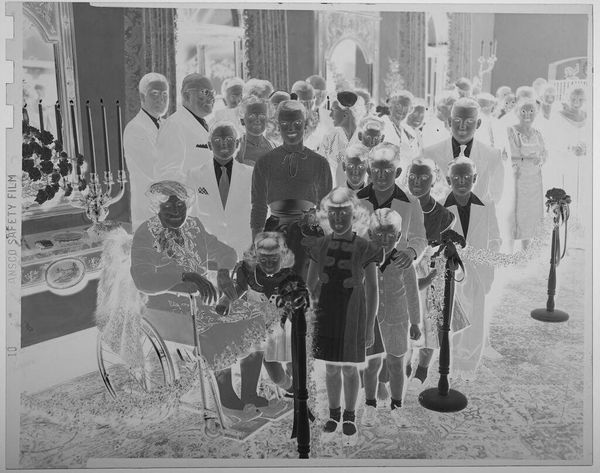 Curator: This untitled photograph by Jack Gould captures a man seated amongst a crowd receiving a kiss on the head. The image, about 2.25 inches square, shows an intimate moment in a public setting. Editor: There's a tenderness here, a casual yet striking display of affection in what seems like a segregated social gathering. The woman's hat and dress also speaks to a specific time. Curator: The negative’s tonal inversions emphasize the textures of clothing and skin, almost like a study in light itself. It makes me think about the labor required to develop such an image. Editor: And I see layers of identity being performed here: gender roles, social class, racial dynamics. What are we to make of this unusual power dynamic in a segregated time? Curator: It's the kind of image that makes you think about the relationships in your own life. Editor: Definitely, a small photograph that speaks volumes about love and social complexity.