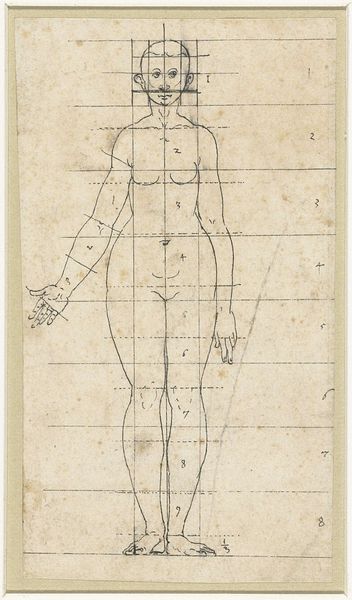 Curator: Here we have an intriguing, rather unsettling image, "Nude with various stab wounds," created by an anonymous artist. Its presence here at Harvard Art Museums speaks volumes about its historical and artistic significance. Editor: My first impression is… intense. The starkness of the figure combined with the graphic depiction of the wounds really grabs your attention. What strikes me is the color, how someone decided to add it. Curator: Precisely. The material aspect is quite significant. Look at the linework, probably woodcut. Then the hand-applied color suggests a specific purpose, perhaps as a medical aid. The bleeding isn't just decoration; it's instruction. Editor: I see that. It's not about aesthetics; it's functional. It makes me think about the labor involved – both the artist carving the block and the person painstakingly adding color. Curator: And the violence of it all! Those wounds aren't just markings; they're invasive. It's a map of pain, of vulnerability, etched onto the body. The choice to leave the artist unnamed also intrigues me. Whose vision of suffering is this? Editor: It makes you wonder about the intended audience. Was this for doctors, students, or even patients? I am thinking about the power of such an image in pre-modern medical practice. Curator: Indeed. It is a stark reminder of how different understandings of the body were and how artists and artisans sought to make sense of them. Editor: I agree. It’s been interesting to see the value in this piece outside of the typical realm of "fine art."