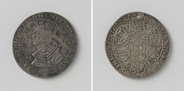Curator: Right, let's dive into this fascinating object. Here at the Rijksmuseum, we have what's known as "Krijgstoerustingen van Karel V voor de oorlog tegen de Turken" – roughly translated, Charles V's military preparations for war against the Turks. It’s a metal engraving dating back to 1532. My initial impression is cold calculation. Editor: I see, you go directly for the feelings this artwork gives to you...Well, the chill that I perceived in this image stems primarily from the use of silver-colored metal, that also transmits coldness for the war implications of Charles V. I'd agree, but for me, the coldness is intriguing rather than off-putting. What I love most, it's the circular design, that brings me back to roman decorations. Curator: Exactly! I think the iconography here speaks volumes, doesn't it? All those emblems, crests, and inscriptions... They really aim for authority and legacy, a true statement of imperial power, and, it's undeniable that it communicates confidence for that time, a strong figure in Charles V Editor: Absolutely. This coin has its roots in the ancient idea that images carried power, especially those depicting leaders or significant events. I mean, imagine, people holding this in their hands, literally holding the might and aspirations of an empire... How to underrate it. For what you were saying, Charles wanted to express imperial and religion authority; This circular arrangement evokes the concept of cosmic order and a divinely sanctioned authority... Also, consider that Charles V's reign saw escalating tensions between Christianity and the Ottoman Empire. He really had the idea to communicate this strength in the collective imaginary, a need. Curator: I totally get that. It’s not just a depiction of arms; it's a symbol laden with intent. There’s almost a theatrical quality. And this type of coins was thought, exactly, for all social classes, to build and uniform all citizens for the idea of an strong empire with a determined leader. Looking back, this piece acts as both propaganda and prayer. Editor: In the end, we may respond with "coldness," as you said. But it's not due to an aesthetic lack; rather, we're responding to the weight of its symbols and its implications for centuries of conflict and cultural interaction. Curator: So well expressed, my dear colleague! It certainly left me something to reflect about for sure. What I also wonder is what it communicates to modern citizens. Perhaps not so different from that ancient coin. A good closure to think a bit more on what is around ourselves and where are roots come from.