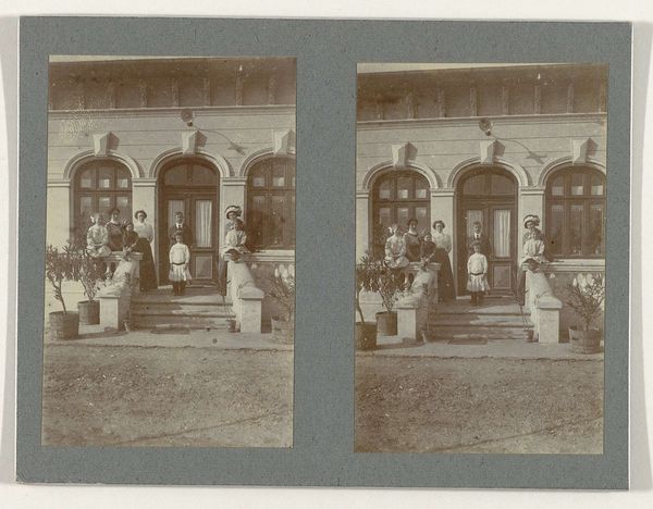 Geldolph Adriaan Kessler made this photograph, *Family Portrait in Front of a House*, without a specified date, likely using sepia-toned printing. It's interesting how photography, like painting, involves a layering of processes, from capturing the image to developing the print. The texture here isn't about thick paint, but the subtle grain of the photographic paper, which gives the image a soft, almost dreamlike quality. The sepia tones add to this, creating a sense of nostalgia, as if we're looking at a memory. Look at the way the light falls on the family's faces, especially the children. It’s gentle and diffused, highlighting their innocence and vulnerability. It reminds me a little of some of the softer, more sentimental portraits by artists like Julia Margaret Cameron, who also used photography to capture the fleeting beauty of life. Ultimately, this photograph, like all art, is an invitation to slow down, to observe, and to connect with the world around us in new and meaningful ways.