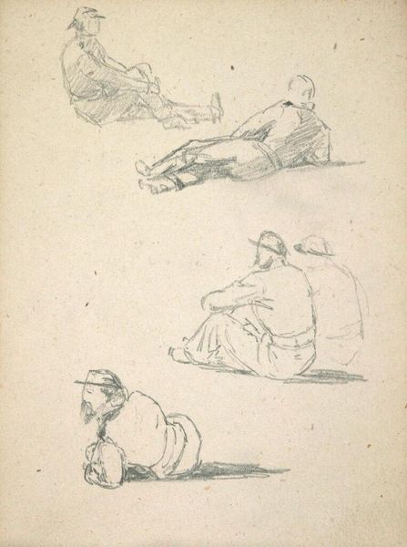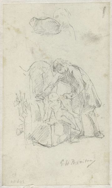George Morland captured these two studies of a man lifting a trunk on a single sheet using graphite. The composition is simple, focusing primarily on the human form and the trunk, with minimal background detail. The upper figure dominates the space with the man hunched over a large, rounded trunk. Morland's use of line is particularly striking. He employs a network of short, energetic strokes to delineate form and suggest volume. The hatching creates a sense of depth and texture, particularly in the clothing and the trunk itself. Notice how the artist plays with light and shadow, using darker lines to define the areas of greatest shadow, adding weight to the figure and the object he strains to lift. The lower figure offers a different perspective, showing a man kneeling beside a smaller, rectangular trunk. This second study complements the first, underscoring the physical effort and the quotidian nature of labor. Morland’s sketches, though simple, invite us to consider the dignity of everyday actions, capturing a transient moment with careful observation.