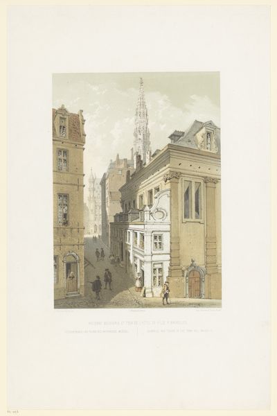 Curator: Before us is a print titled "Gezicht op het stadhuis te Leuven" by François Stroobant, likely created sometime between 1852 and 1878. It's currently housed at the Rijksmuseum. Editor: Immediately, I am struck by the dreamlike quality despite the rather precise architectural depiction. The scene has a very specific feel, as though lifted from a legend. Curator: Indeed. Stroobant employed etching and engraving techniques, mediums which themselves have long histories, to depict this cityscape. We see figures on horseback which imply transit and even commerce. What meanings do you perceive at play? Editor: Well, the Town Hall of Leuven, of course, is the dominant symbol here. Look at its impossibly ornate facade – it evokes civic pride, sure, but it also communicates a profound reach for transcendence. Each little statue and window, layered upon layer...it’s overwhelming! Curator: I’m drawn to how the printmaking process allowed for the reproduction of this image. Consider the social impact of disseminating views of Leuven's civic architecture. It makes otherwise localized icons of statehood newly portable, mass-produced for various levels of access. Editor: But see how that distribution serves the underlying symbolism! The architectural detail of that Town Hall is presented with meticulous accuracy to underscore the ambition and the almost obsessive faith of its makers and commissioners. These buildings *were* built and these are signs of what and why. Curator: The deliberate labor invested, yes – the etched lines mimicking stone, attempting to hold history captive within a manufactured object… fascinating how technique and aspiration become entwined. Editor: I find it interesting to think about how Stroobant captured that impulse, translating material grandeur into something both ethereal and concrete, an imprint of enduring civic hope made physical through distribution. Curator: A reminder, I suppose, that images carry power but it's the materiality that gives it to them. Editor: Or is it materiality which facilitates symbolic transfer, bringing grand buildings into more hands than otherwise ever could, enshrining collective memory with each careful line? Curator: Perhaps in its essence. These conversations of our values. Food for future thoughts.