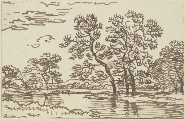 Curator: The work before us, housed here at the Städel Museum, is titled "Gewässer, links ein Wäldchen, rechts ein Felssporn," which translates to "Waters, a small forest on the left, a rocky spur on the right." It's an intriguing drawing attributed to Franz Kobell. Editor: The immediate impression is one of melancholy. The stark lines, the grey tones of the paper, and the composition itself evoke a quiet solitude. Curator: Kobell has captured what feels like a memory of a natural scene using ink on paper. Note the contrasting techniques: the rapid, almost scribbled lines that give the impression of dense foliage, against the calmer, horizontal strokes suggesting water. What feelings might these elements and that contrast evoke? Editor: The scribbled foliage speaks to nature’s chaotic vitality, a sense of wilderness unsubdued. But alongside that untamed energy is this clear formal structure in the placement of elements, left and right, dark and light, forest and water—suggesting an attempt to bring order or reflection on that vitality. There is this tension. I am interested if his contemporary viewers read that same symbolism, the taming or human reading of the raw nature they experienced everyday? Curator: I think the historical context deepens the impact of those choices. During that era, landscape drawings served both as documentation and as personal expressions. A kind of meditation, but not like you may be thinking with more direct iconography, but the natural elements stand alone representing feelings without obvious visual ques. Editor: Absolutely, art became entangled with developing national identity. Were landscape scenes selected and framed in such ways as to symbolize particular virtues or reflect idealized visions of the fatherland? Do the forest and rocky prominence function almost as characters in a landscape of developing cultural or social memory? The ink becomes a political tool? Curator: Possibly, although with an image this simple I am reticent to lean too heavily on one concept or another. There's a simplicity here, an honesty to his method. The act of drawing, a visual conversation the artist had with nature that echoes a long visual lineage of rendering landscape as more than surface or fact. Editor: True. Perhaps it's best to allow the drawing to exist within the layered and contradictory social landscape from which it emerged, while also giving it the personal artistic license it demands. It reminds me of that balance we try to reach here at the museum. Curator: It’s fascinating how a seemingly simple ink drawing on paper can invite so much thought.