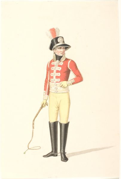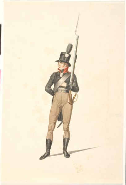 Editor: This is Johannes Senn's "Kongelig livjæger," created in 1807, using watercolor and drawing. I'm struck by how meticulously the uniform is rendered; you can almost feel the weight of the rifle and the precision of each button. What can you tell us about the context of this artwork? Curator: Well, considering the socio-political climate of 1807, this image serves less as a simple portrait and more as an assertion of power and order. Senn captures the regalness and authority of the royal guard, contributing to the Danish monarchy's strategy of projecting strength. Think about how imagery of soldiers, especially those directly linked to royalty, plays in constructing national identity. What details within the illustration emphasize this power dynamic? Editor: I suppose the upright posture, the direct gaze, and maybe even the puff on the hat add to that image. Is the choice of medium significant here? Curator: Absolutely. Watercolor and drawing, while capable of great detail, were also accessible and relatively reproducible. This suggests a potential dissemination of the image beyond elite circles, reaching a wider audience and shaping popular perceptions of the monarchy and its military might. This Romanticized view certainly hides some difficult facts of Danish rule and society. Does this shift your perspective at all? Editor: It does! I initially saw it as just a well-done illustration, but knowing it's tied to projecting power and shaping national identity changes everything. It’s a fascinating insight into how art can function as a tool of social and political influence. Curator: Exactly. Examining art through its historical and institutional context unveils layers of meaning and intention that might otherwise be overlooked.