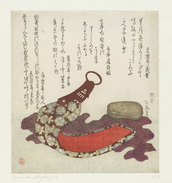 Yashima Gakutei created this woodblock print called "New Year's Sake." During the Edo period in Japan, of which Gakutei was a part, the cultural landscape was rich with the rise of the merchant class and a corresponding flourishing of arts and culture. Prints like this one reflect the everyday life and seasonal celebrations of the time. Here, the sake pot, adorned for the New Year, becomes a signifier of domestic festivity. A red lacquered sake cup decorated with floral motifs sits beside it. The New Year celebration was a moment of renewal, a chance to reflect on the past and usher in good fortune. The presence of sake underscores its importance in social rituals, solidifying bonds within the community. While seemingly a simple still life, this print holds a mirror up to the values of community and celebration. It makes me wonder about the hands that poured the sake, the stories shared, and the hopes raised for the year ahead.