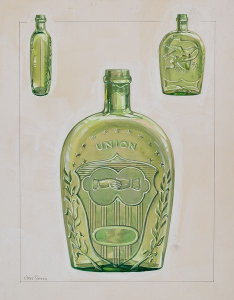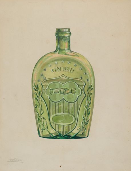 Curator: Here we have Charles Caseau's "Flask," a watercolor drawing likely made around 1936. Editor: It's unexpectedly tranquil. That soft, almost muted teal… it's both calming and evocative of Depression-era designs. The use of watercolor lends it a delicate, preliminary feel. Curator: Indeed. Beyond its aesthetic qualities, this piece prompts us to consider the labor involved in producing designs for mass consumption. The subtle lines indicating its potential fluted design… This was intended for industrial production, a blueprint of sorts. Notice the "Louisville, KY" marking – suggestive of specific factories, perhaps a glassworks aiming for regional markets. Editor: The "Louisville, KY" directs us, certainly, but let’s observe this avian emblem. It's almost heraldic. What could these abstracted birds represent within the visual culture of that time and place? Are they specific to Louisville, markers of local identity, or a more generic symbol of prosperity people identified with at the time? The image reminds me of a sort of manufactured mythology. Curator: Interesting perspective. The fluting is also something to consider from a design standpoint. The parallel lines of the fluting, though ornamental, were likely functional as well; influencing both grip and glass distribution. Were cost-effectiveness and design functionality in agreement with popular design at this moment in history? I see here an intersection between utility and artistry dictated by manufacture and market demands. Editor: And these repeated motifs give shape to our perceptions as well. Doesn’t it subtly echo the hope for stability and continuity, even amidst economic hardship? A desire literally molded into glass, a hope reflected on an emblem of Kentucky, for instance, its heritage. Curator: So we're both drawing inferences from the object, looking to both its tangible form and symbolic significance. One lens trained toward material circumstance, the other to encoded meanings. Editor: Precisely. What appears simply to be a rendering of a commercial object reveals far richer details on how identity and production intersected within material design.