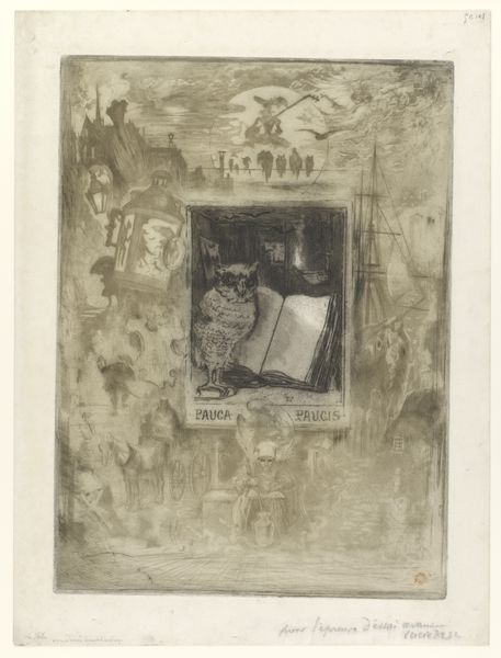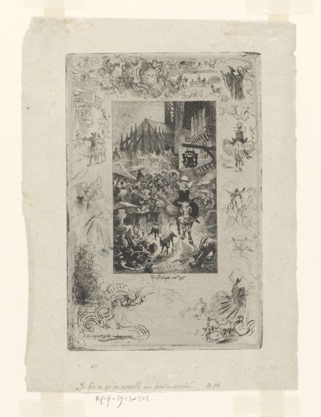Curator: Let’s talk about Rodolphe Bresdin’s "Interior with a Spiral Staircase," made sometime between 1839 and 1885. It’s an etching, full of dense detail and cross-hatching. What are your initial impressions? Editor: Claustrophobia, definitely claustrophobia! I feel like I'm peering into a very cluttered mind. The details, although finely rendered, almost suffocate the scene. It’s a landscape, yes, but an internal one. Curator: Exactly! Bresdin had a flair for cramming symbolism and allegorical elements into these intensely detailed scenes. Look at how he uses light—or rather, the lack of it—to create a somber, almost oppressive atmosphere. Do you see certain recurring images here? Editor: I'm struck by the figure seemingly caught in a doorway. It reminds me of a symbolic threshold, the movement from the dark into some semblance of light—but it's not quite a liberating moment. Curator: Precisely. Thresholds are crucial. Bresdin was deeply interested in depicting both earthly existence and metaphysical quests, so this space becomes liminal. The very architecture echoes our subconscious. Those stairs especially feel... endlessly ascending. Editor: And notice how the spiral staircase dominates, but never quite leads the eye out. Spirals themselves have always represented transcendence, growth, or a sort of unraveling, but here, its oppressive geometry hints at something much darker. This almost reminds of Piranesi’s etchings of fantastical prisons! Curator: Yes, that resonance is striking. Both tapped into the anxieties of enclosure and psychological space. And think of the date--Bresdin worked on it throughout his life, reflecting his shifting moods. It is intensely personal, and it whispers stories instead of telling them. Editor: This etching speaks volumes—or perhaps secrets—with every carefully etched line. The layers create a captivating enigma! Curator: And isn't that the best kind of art, ultimately? It leaves us pondering long after we've looked away.