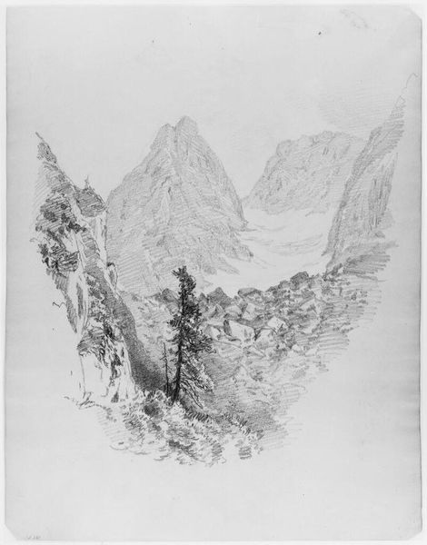 Curator: John Singer Sargent’s “Study of a Cliff” reveals a stark landscape, focusing on the play of light and shadow across the rock face. Editor: The first impression is of brutal geological processes, and the sheer labor involved in capturing this in pencil. Curator: Observe how Sargent uses line to define form. The diagonal thrust creates tension, offset by the subtle gradations of tone. Editor: Consider the kind of graphite used—likely soft, allowing for those dramatic shadows. What kind of paper accepts that much material? Curator: It is more than just a record; it is a study in contrasts, a meditation on the sublime power of nature. Editor: Right, and a tangible record of Sargent's physical engagement with the landscape, forcing us to reflect on how we extract from and represent the natural world. Curator: Indeed, it's a concise yet powerful investigation into form, line, and the dialectic between light and shadow. Editor: Absolutely, and it also underscores the material basis of art production and how much labor went into a work like this.
