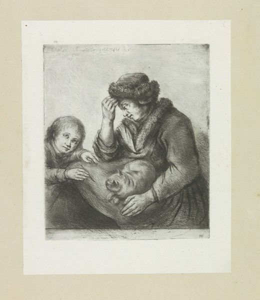 This is 'Man en kind aan de eettafel' by Jan Chalon, made with etching. The artwork is dominated by a muted palette, with dense, rhythmic lines shaping the figures. The composition is vertically oriented, drawing our eyes to the faces of a man and child hunched over a sparsely laden table. The etching technique, with its network of fine lines, emphasizes the texture and the play of light and shadow across the subjects' faces. The density of the lines creates a sense of depth, drawing the viewer into the intimate, yet austere setting. The arrangement of the figures in this composition, with the man protectively positioned over the child, speaks to broader themes of familial responsibility. The starkness of the setting suggests a narrative of struggle, where the focus on the characters' faces evokes a sense of empathy. The artist's meticulous rendering of the scene invites us to consider the social conditions and emotional landscape it reflects. The artwork operates as a sign, rich with cultural and emotional meaning, inviting reflection on the human condition.