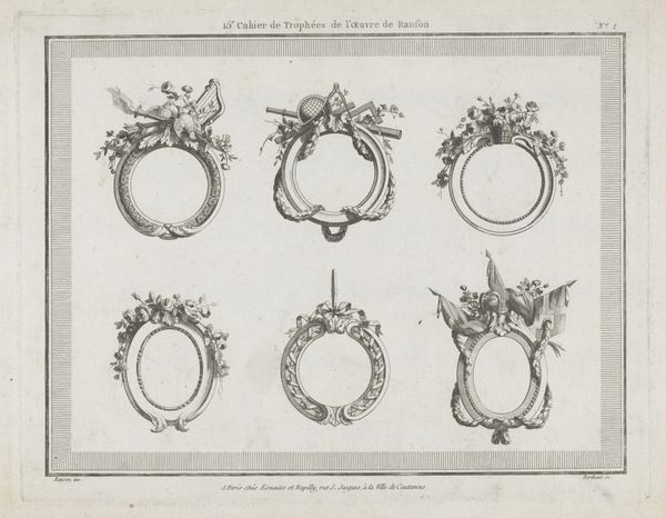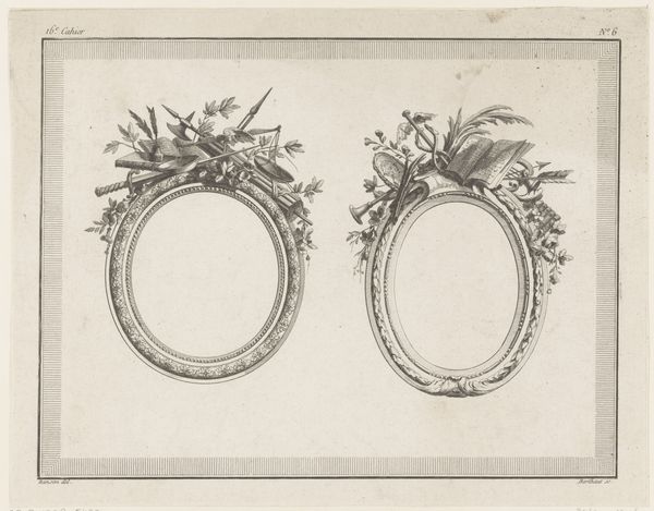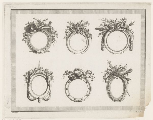 Curator: Right, let’s take a look at this print, shall we? It’s entitled “Twee ronde omlijstingen,” which translates to "Two Round Frames,” crafted by Augustin Foin between 1784 and 1785. It's an engraving, here in the Rijksmuseum. Editor: Hmm, they remind me of looking into a pond, if a pond could somehow hold only beauty and be perfectly still. I wonder, were these actual frames? Curator: More likely, they served as models, particularly in a period deeply engaged with neoclassicism. The print format allowed for broad dissemination of designs and stylistic concepts, facilitating their uptake by artisans and workshops across various locations and classes. It is interesting to think how people would receive artmaking blueprints at the time. Editor: I get it. Like architectural renderings—these were blueprints for… prettiness. There's an aspirational quality, right? These aren't just frames; they represent the *idea* of a perfect frame, like something Marie Antoinette would put her portrait in. Curator: Precisely. It reflects a world obsessed with refinement. Think of the political undertones during the Enlightenment! Decoration as power, even control. Editor: I think, sometimes, the power isn’t political but personal, don’t you? Like a mirror reflects not only light but also the beholder’s self. We adorn what we deem most valuable. A picture of our child, a painting from our favorite artist, to reflect our soul in a certain light. Curator: Very insightful. In our contemporary discourse, though, there is more value attached to artistic autonomy rather than this adherence to formal models. But in that period this balance and symmetry signaled wealth. Editor: That makes me reflect how, today, the power of something plain can also feel radical... Thank you. That engraving just started to shout louder. Curator: A complex period of aesthetics; reflecting upon the role of decoration—certainly a lot to consider!