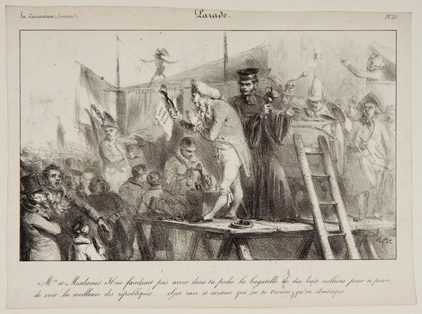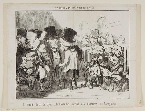 Editor: Here we have Honoré Daumier's "The Disembarkment." It looks like a lithograph. The sharp lines and frantic energy make it feel like chaos at the docks. What’s your take on what Daumier is trying to say here? Curator: It's a powerful commentary on European colonialism, seen through the lens of the Opium Wars. Notice how the European is centered, elevated by his hat, while the Chinese are depicted as a mass, almost predatory in their eagerness. Editor: So it's about power dynamics? The caption mentions police. Curator: Exactly. Daumier highlights the social disruptions caused by Western intervention, painting the local population as both victims and participants in a system imposed upon them. It makes us question who benefits and who suffers in such encounters. Editor: That really changes how I see the image. I was just looking at the lines, but now I see the underlying political message much more clearly.