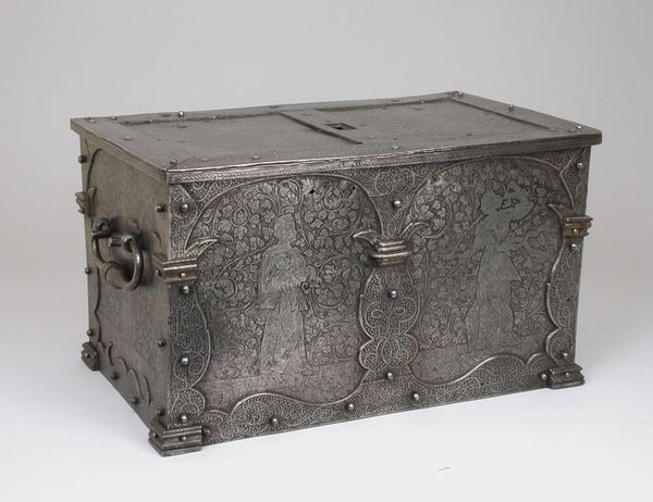 Curator: Before us stands the "Book chest of Hugo de Groot," an evocative example of decorative art from the early 17th century. Crafted from wood around 1600-1615, this chest whispers tales of knowledge and secrets, now residing here at the Rijksmuseum. Editor: It feels incredibly weighty just to look at! Dark, solid wood and heavy ironwork; it suggests not only security but perhaps even oppression. What was being protected that warranted such robust containment? Curator: That's a brilliant interpretation. Hugo de Groot, or Grotius as he's often known, was a pivotal figure in the development of international law. This chest symbolizes the safeguarding of ideas, particularly pertinent given the turbulent political and religious landscape of the time. He advocated for the concept of natural rights during an era of almost constant conflict and conquest in Europe and abroad. His intellectual life placed him directly in political harms-way! Editor: Ah, now I understand. The chest functions almost like a reliquary, preserving his vital intellectual work against the potential erasure by adversaries. Does the craftsmanship carry any specific symbolic meaning related to that struggle for ideas? Curator: I think the deliberate construction methods of the craftsman could very well allude to his imprisonment within the Loevestein Castle, and his ingenuity towards his escape where he famously fled in a book chest! A physical symbol of confinement, perhaps the vertical elements stand out like bars? Editor: The form and material also tell another story about continuity and cultural memory. This object’s symbolism feels both solid and stoic. Despite shifts in legal thought or political regimes, that fundamental desire to secure intellectual freedom seems eternal, right? Curator: Absolutely. And it reflects how material culture embodies persistent human values. It transcends Grotius and enters the realm of symbolic potential that informs our values even today. Editor: This really makes you appreciate the chest's enduring presence as an object. So, what looks at first glance to be merely antique furniture truly contains a microcosm of socio-political tensions and philosophical legacy! Curator: Precisely. Its weightiness mirrors the weight of ideas and the ongoing struggles for justice. Editor: Well, it is a truly enlightening exploration. Curator: Indeed. A reminder that objects hold the echoes of history.