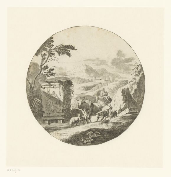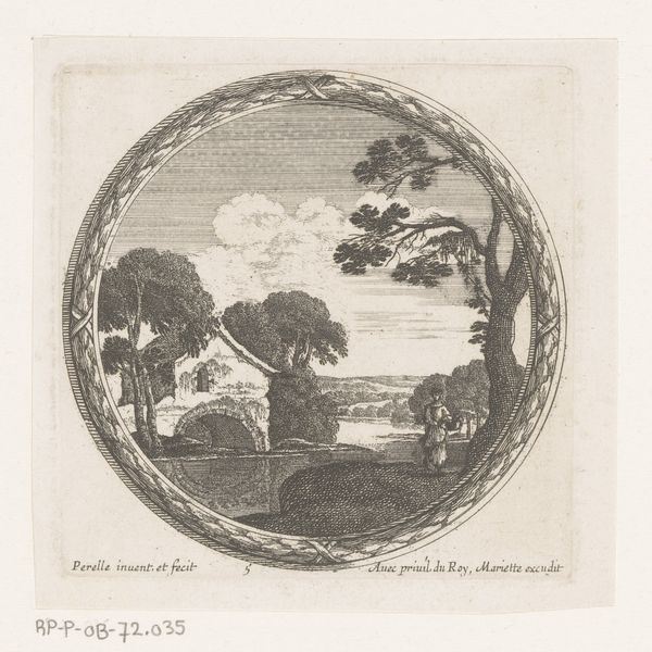 Nicolas Perelle created this print, "Landscape with Figures on a Path by a Ruin," using etching, a technique that allowed for detailed replication in 17th-century Holland. Notice how Perelle uses the circular format to frame a romanticized view of nature, complete with a crumbling ruin and travelers on a path. This imagery speaks to the Dutch fascination with landscape, but also to broader European trends in appreciating the picturesque qualities of the antique past. Prints like these were often collected in albums, reflecting the rise of a consumer culture where images could be circulated and appreciated as both art and commodity. The Rijksmuseum, where this print is held, is itself a product of later historical developments in the creation of national art collections. To truly understand this work, one might consult period inventories, art market records, and treatises on landscape aesthetics. It is through these materials that we can better understand the image's role within the visual culture of its time.