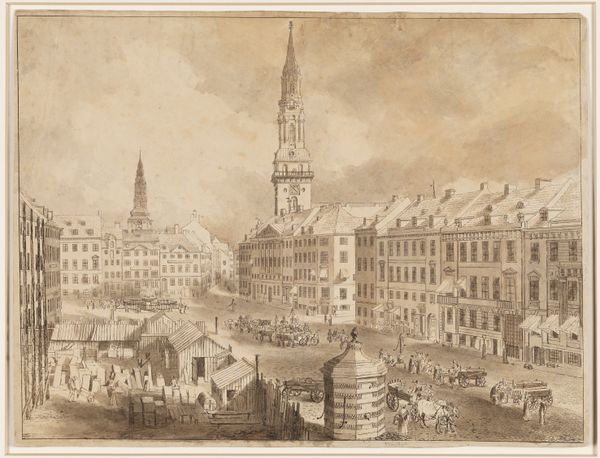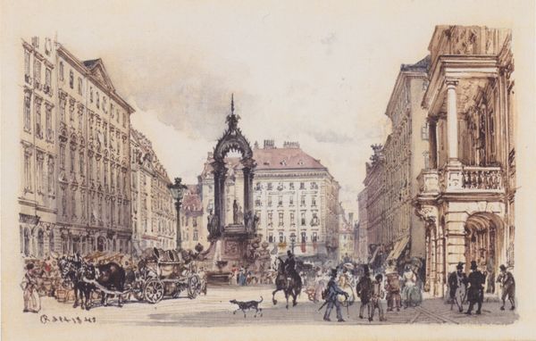 Curator: I find myself quite drawn to the atmospheric quality of this watercolour painting by Rudolf von Alt, entitled "The Line of Hunter in Vienna," created in 1844. Editor: It strikes me as something both grand and intimate simultaneously. There's an incredible depth created by the perspective, yet the subdued colors and meticulous detail make it feel so personal, as if captured from a private window. Curator: Precisely! Alt's skill with watercolor allowed him to capture the bustling city life of Vienna with incredible accuracy, offering insights into the urban experience and societal structure of the time. Notice how the figures, seemingly small, suggest the hierarchies present in the city. Editor: I notice the presence of the church tower too, how it punctuates the scene with its verticality. Is there something to be read into the placement? Its prominent visual importance, given its geographical distance within the street layout itself? Curator: Absolutely, the church acted as a major force, socially and politically, so its prominent location here likely represents that authority in 19th-century Viennese life. And consider how the buildings, though rigid in structure, are softened by the light and shadows. Editor: This soft romantic light really does add to the symbolic depth and mystery. Do you think this artwork gives insight into the shifting attitude towards public spaces at the time? How they function both as settings for political statement but also everyday lives? Curator: Definitely! Alt was adept at chronicling not only the appearance of Vienna, but also the social interactions that defined the city's character. Here we witness a dynamic interplay of movement, from the carriages and horse riders, all participating in this elaborate choreography that represents the day-to-day public existence. Editor: Seeing this, I'm reminded of how artworks such as these allow us to understand the complex forces that shaped the world we live in today. The Romanticism and attention to architecture highlights the evolving dialogue between human expression and public identity in society. Curator: Indeed, by immortalizing this street scene, Rudolf von Alt has invited us to ponder not only the evolution of Vienna, but our own ever-shifting relationship with the cities we inhabit today. Editor: Ultimately, this snapshot, rendered in watercolor, grants us an opportunity to interpret the historical pulse through visual artifacts like this.