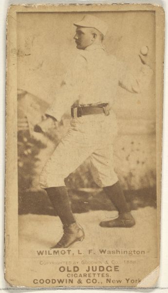 Curator: Looking at this 1888 albumen print from Goodwin & Company, titled "Rooks, Left Field, Chicago, from the Old Judge series," my immediate impression is of its striking tonal range. The sepia tones give it a beautiful antique feel. Editor: Absolutely, it possesses a tangible warmth. But what truly interests me is its genesis, these Old Judge cards existed as inserts in cigarette packs. Imagine, this collectible wasn’t conceived as art; it was a promotional tool tied to a specific material exchange, the sale of tobacco. Curator: Indeed. The photograph's composition—the angle of his body, the position of the ball in his hand—seems designed to capture the ideal form, almost striving for some classical ideal. And then it is printed at scale. It's really fascinating. Editor: Quite so, but consider the physical creation of this card: the labor involved in producing the albumen print itself, the sourcing of the materials, and the mechanisms of mass production. The fact that it became so widespread reflects shifts in industrial practices and consumer habits in the late 19th century. Curator: The figure dominates the composition. A wonderful tonal contrast, darks giving way to highlights, allows a sort of pictorial depth even within this limited format. The pose, though specific, takes on a universal quality. We understand action through symbolic gestures, creating its effect through lines, shapes, tonal relationships. Editor: It's true, it also speaks to the popularization of baseball and its athletes. Here, Rooks isn't merely an individual; he's an item, a commodity traded and consumed along with tobacco. The advertising is part of its statement and meaning, beyond whatever qualities it has compositionally. Curator: A point well-taken. I concede that the interaction of commercialism and image here shapes how we receive the formal characteristics, as well as our impression of baseball at the time. Editor: Examining the piece reminds us that visual art isn't solely the product of an artist's singular vision, but a cultural artefact deeply embedded in layers of manufacturing and socioeconomic conditions. This photograph illuminates material life more than we might realize at first glance.