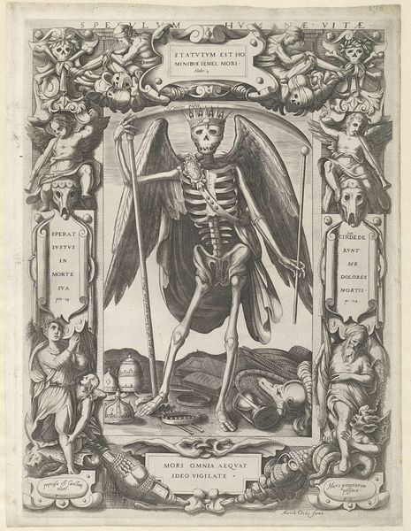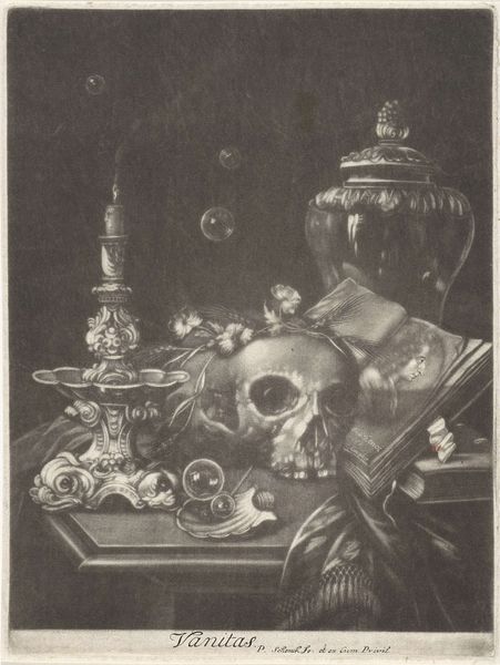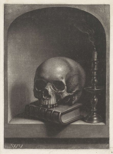 Jan Saenredam created this engraving, "Death's Head," around the turn of the 17th century using the intaglio process, a printing technique where the image is incised into a metal plate. The fine lines we see are the result of a skilled hand using a burin to carefully carve into the copper, a testament to the labor and precision required. The stark contrast between the delicate lines and the blank paper allows Saenredam to build up tone and texture, giving the skull a sense of volume and decay. This wasn't just about aesthetic skill, though. In a time of religious and social upheaval, the printing press was a powerful tool. Engravings like this one weren't just art objects; they were a way to disseminate ideas and imagery widely, reflecting on mortality and the human condition. Saenredam masterfully reminds us that art, even in its smallest form, can carry profound cultural weight. It challenges us to think about the relationship between skill, production, and the broader themes of life and death.