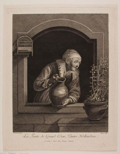 Curator: Here we have "Woman with a Basket of Fish" by Robert Delaunay, part of the Harvard Art Museums collection. Delaunay, born in 1885, captures a quiet scene in this intimate print. Editor: It feels melancholic, doesn't it? The dark enclosure contrasts so strongly with the light on her face, and that glimpse of people outside...it hints at a world she might be missing. Curator: Precisely. Consider the social context: such images often reinforced idealized portrayals of labor, suggesting contentment even when life was hard. Is it truly a celebration, or a subtle commentary? Editor: Perhaps it's both. The fish spilling out, the worn basket... they speak of daily grind. But there's also a strange beauty in the arrangement, a dignity in her focused expression. The artist makes us see her. Curator: And the artistic merit lies in Delaunay's ability to evoke these complexities. A seemingly simple scene, laden with socio-economic implications. Editor: It stays with you, this image. You begin to ask, what's her story? What’s beyond the frame, out there with those other souls on the horizon? Curator: Indeed, art prompts us to consider such questions, and to reflect on our own perceptions of work and worth. Editor: Exactly, and you know... maybe that’s the real catch of the day.