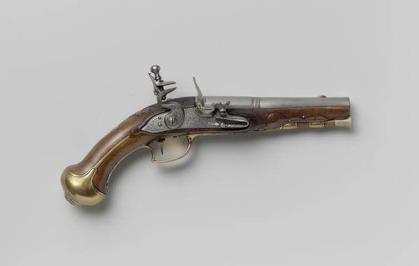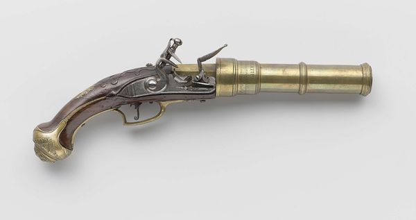 Curator: Here at the Rijksmuseum, we have a curious piece called "Kruittester," a powder tester thought to be made sometime between 1668 and 1715 by Paulus van Walsen. Editor: Well, it certainly has a peculiar form, almost unsettling. The abruptness of the curves clashes intriguingly with the crispness of the metal detailing. It projects a very stark impression. Curator: Precisely! The object’s power emerges from that dynamic interplay. Look at how Van Walsen juxtaposes the dark wood with the ornate brass. There’s a very definite relationship in how the artist draws our eye from the organic to the manufactured. Editor: Ah, yes, the division is strategic, isn’t it? Wood gives way to intricately engraved brass; it reminds me of ancient alchemical instruments. One might find symbols that carry profound historical significance; consider how elemental materials held cultural memory. The inscription, "MASTRIICHT" what might that reveal? Curator: A testament to its place of origin. By featuring it so boldly, Van Walsen is declaring it a product of esteemed craftsmanship. Editor: This "Kruittester" is not simply for gunpowder but echoes a grander narrative. How intriguing to consider how Van Walsen uses form as a marker of its creation. What kind of cultural authority does that brand grant? Curator: The brass components, each individually tooled and assembled, contribute to a complexity that amplifies its purpose beyond mere utility. And its metallic gleam signifies importance beyond measurement. Editor: Ultimately, this piece speaks to cultural continuity embedded in even the most functional objects. We have not only material to admire but an invitation to delve deeper into layers of past ingenuity. Curator: A keen perspective on an uncommon object. The interplay of function and adornment presents a complex composition indeed, yielding greater insight on reflection.