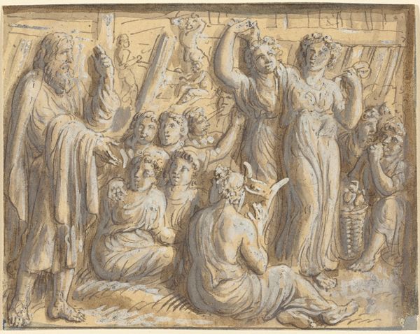 Editor: So, here we have Luigi Ademollo’s drawing, “Moses and the Brazen Serpent,” rendered in ink on paper. The drama! The figures contort and writhe – it’s quite a scene of chaos and desperation. What exactly is happening here? Curator: Well, at face value, it illustrates a biblical story, a common subject for art through the ages, of course. But consider how such a dramatic depiction might function in a specific social context. How does visualizing this particular moment in religious history reinforce certain power structures? Editor: Power structures? Could you expand on that? Curator: Certainly. Think about it: Ademollo presents Moses as this powerful intercessor, holding aloft the cure for the plague. The people are utterly dependent, writhing in pain, eyes fixed on him. The imagery promotes the idea of hierarchical leadership, right? God, Moses, the people. Who would commission such an image, and what purpose might it serve beyond simple illustration? Editor: Maybe someone seeking to reinforce their own authority or promote the church's? This could almost be propaganda. Curator: Precisely. It’s crucial to remember that artistic choices are rarely neutral. The depiction of suffering, salvation, and leadership within a religious framework serves particular ideological ends. Note also the visual language – the echoes of classical sculpture, imbuing the scene with a sense of timeless authority. Editor: That makes total sense. It’s not just about the story; it’s about how the story is being told, and *why*. Curator: Exactly! And how that ‘why’ is intrinsically tied to the artwork’s position in society. This really opens my eyes to the social and cultural contexts of art. Editor: Mine too! I'll definitely consider the public role of art, especially when it portrays a moment in history, going forward.