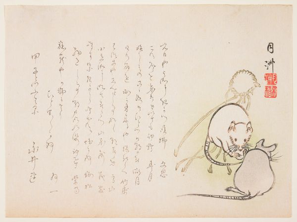 Editor: This untitled work, a drawing by Yosa Buson, presents a curious scene in ink. There’s a figure that appears almost like a…well, an egg with a face, and a cat, both rendered with such delicate lines. I'm struck by the overall sense of gentle humor and the integration of calligraphy. What do you see in this piece? Curator: It's tempting to see just whimsy, but Buson’s work operates within a specific historical and social context. Think about the Edo period in Japan, and the rising merchant class that embraced Ukiyo-e art. What role did art play in a society with strict social hierarchies? This “egg” figure, seemingly innocuous, could be a subtle commentary on social expectations, perhaps the artist critiquing conventional portraiture, gently poking fun at the rigid norms. Editor: I hadn’t thought about it as social commentary. So, the simplicity is intentional, perhaps even subversive? Curator: Precisely! And notice how the cat, a common motif in Japanese art, is depicted. How does Buson subvert the typical representations, especially considering the restrictive social expectations surrounding women at the time, often associated with domesticity, similar to the image of a cat? The expressive ink work, reminiscent of calligraphy, reinforces the artist’s personal voice in the artistic landscape, and how could it serve to emphasize Buson's message and reflect certain aspects of Japanese aesthetic culture and the historical conditions within which art production takes place? Editor: That makes me see the piece so differently! I was just focusing on the charming qualities, but understanding the context really enriches the experience. Curator: It’s through questioning and connecting these historical threads with contemporary lenses that we gain deeper insights. Art history is a constant dialogue, one where we question, challenge, and ultimately, re-interpret the artwork. Editor: This was so helpful. Thank you. Curator: The pleasure was all mine.